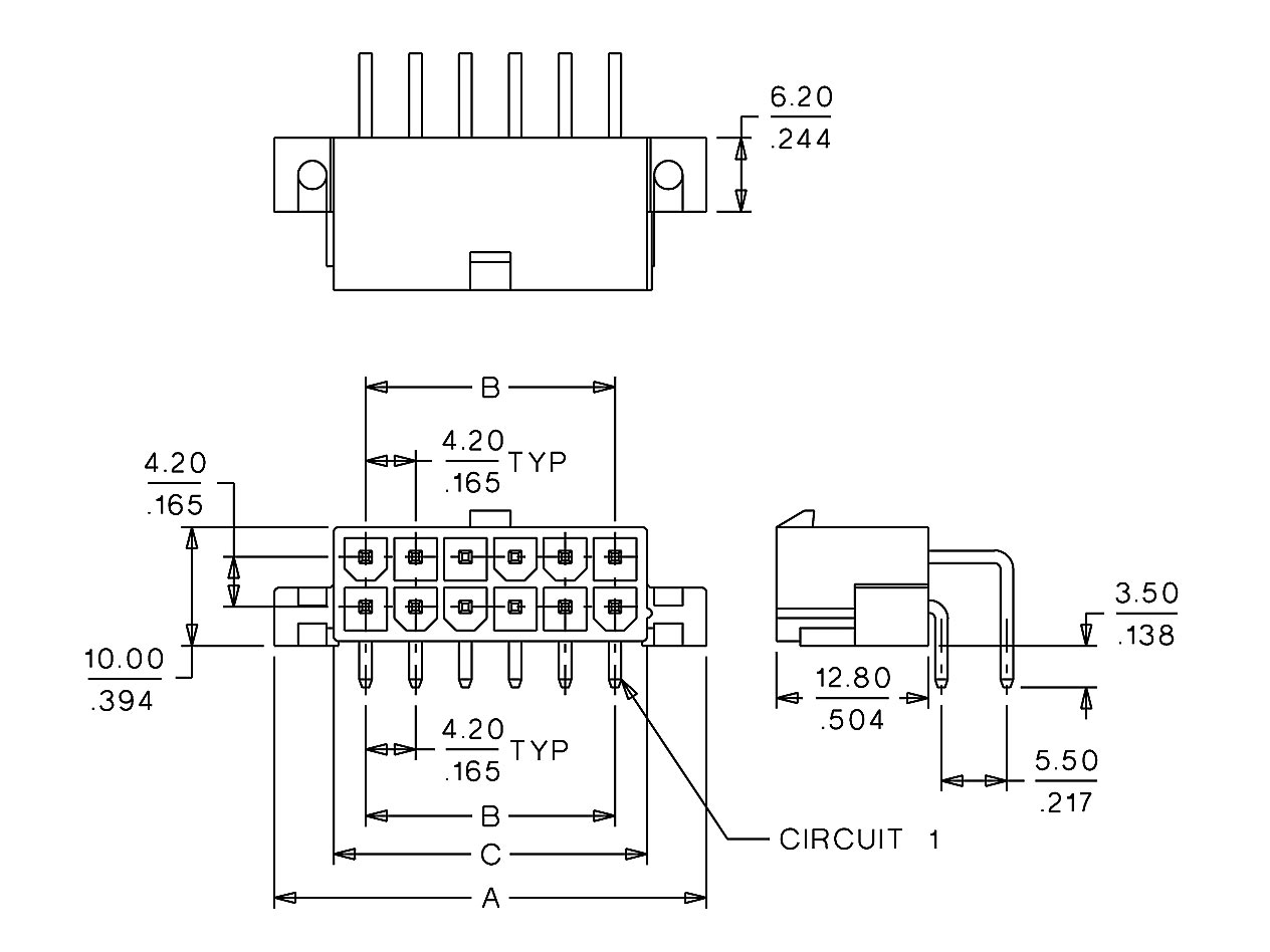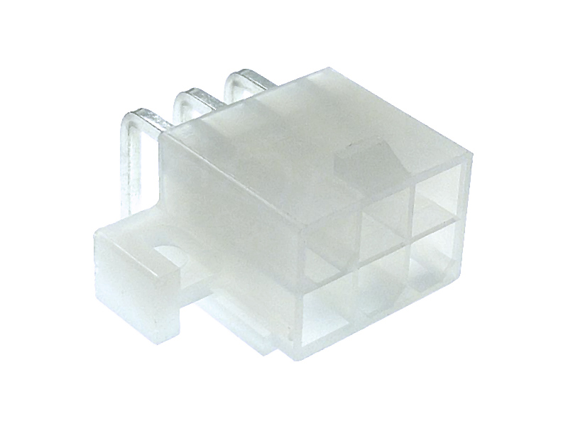 Conector Minifit macho-codo, 2×3 vías, paso=4.20mm.
