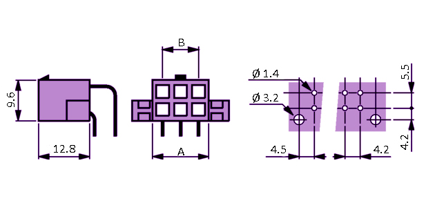 Conector Minifit macho-codo, 2×4 vías, paso=4.20mm.