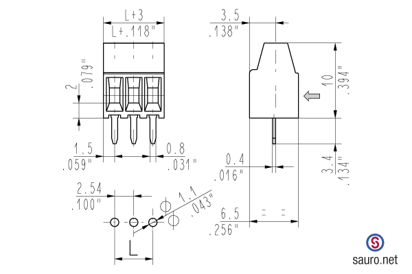 Especificaciones técnicas de la borna ascensor para PCB de 3 pines con paso de 2.54 mm