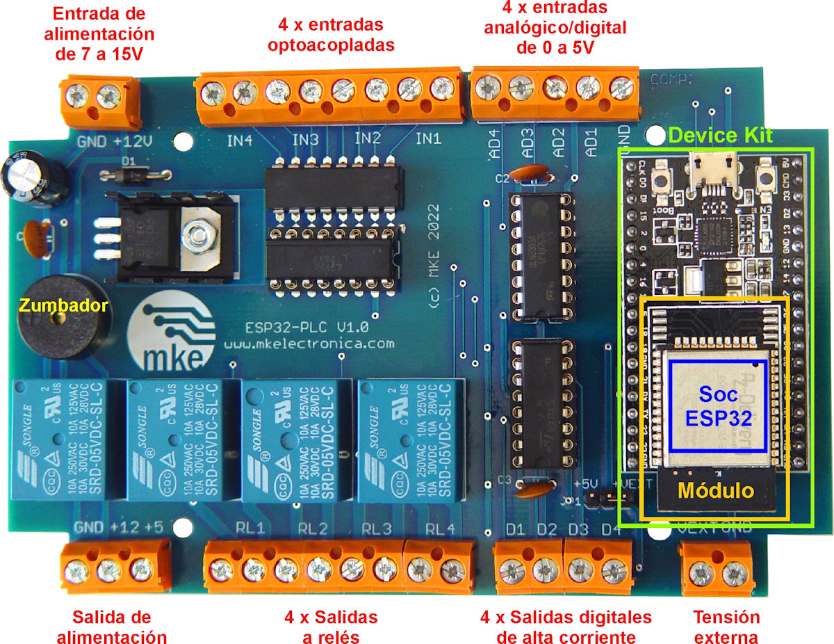 - Controlador lógico programable basado en ESP32-DevKitC con módulo ESP32-WROOM-32.
