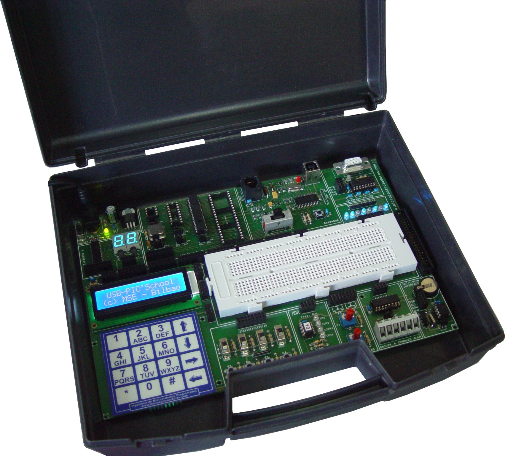 El USB-PIC’School es un laboratorio didáctico diseñado para el aprendizaje y desarrollo de aplicaciones basadas en microcontroladores PIC de Microchip. Este entrenador integra una amplia colección de periféricos y recursos que permiten experimentar con sistemas embebidos tanto a nivel de hardware como de software, convirtiéndose en una herramienta ideal para formación técnica, centros educativos y proyectos de electrónica aplicada.